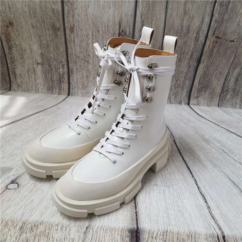 Prova Perfetto Patent Leather Boots Women Thick Bottom Lace-Up Knight Motorcycle Bota Feminina Woman Mid-Calf Non-Slip Stivali