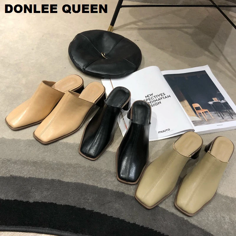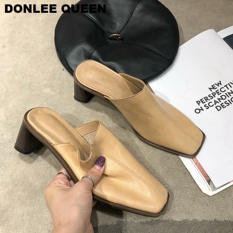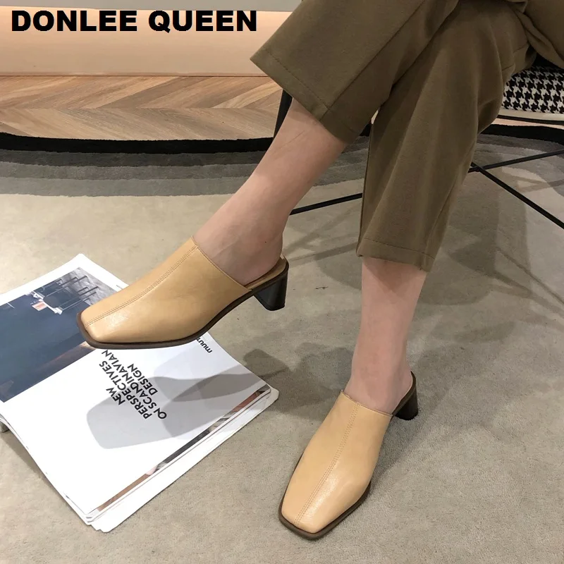 Elegant Thin High Heels Slippers Women Spring Slip On Mule Shoes Women Square Toe Casual Outdoor Slides Flip Flops Zapatos Mujer