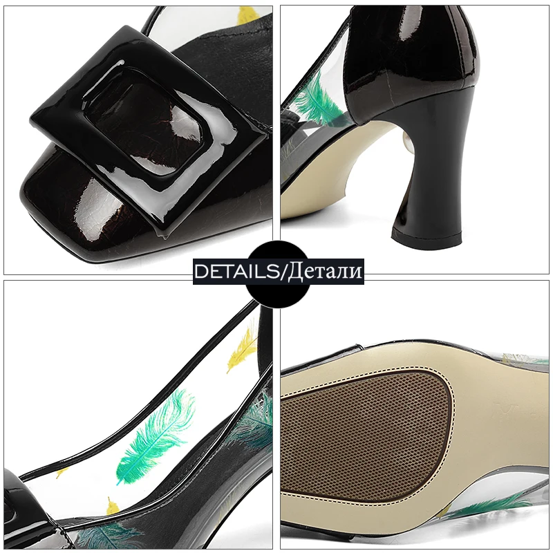 Limited Offer Isnom Patent Leather Pumps Women Square Toe Footwear Transparent Print Pvc Pearl Shoes Female High with FREE Shipping Worldwide!